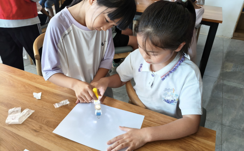 在实验环节,学生们分组协作,利用精心准备的材料包中的木片、玻璃珠、载玻片等材料,按照步骤亲手组装简易列文虎克显微镜。活动现场,孩子们全神贯注地调试设备:有的小心翼翼地固定玻璃珠,有的反复调节物距寻找最佳成像位置,还有的互相配合调整手电筒光源角度。当第一个小组成功将标本影像清晰地投射到白纸上时,现场爆发出阵阵欢呼。