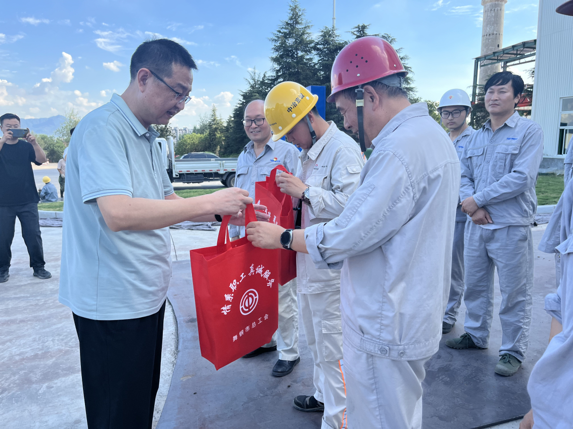 同日下午,市总工会党组书记、常务副主席李飞带队来到舞钢市重点项目建设工地舞钢460MM连铸机施工现场,为正冒着高温紧张施工的劳动者送去了防暑物资。