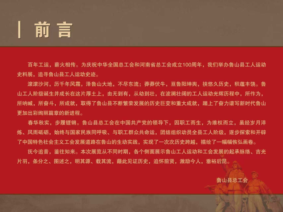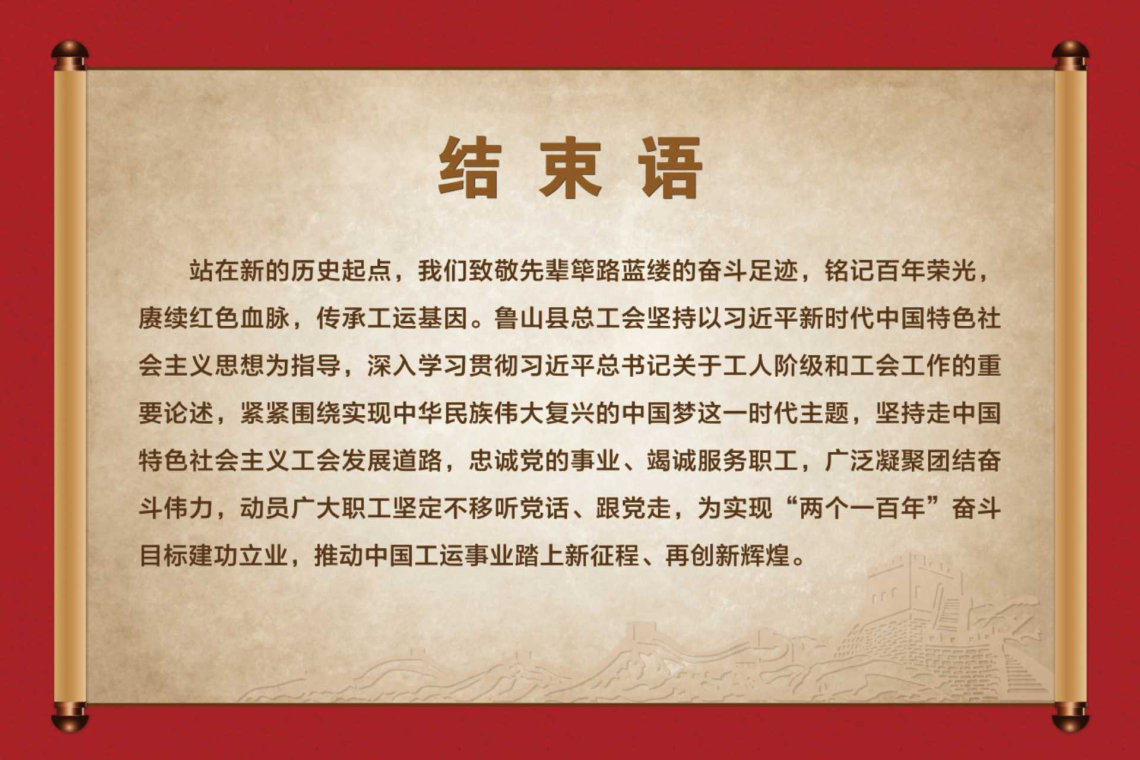 为庆祝中华全国总工会和河南省总工会成立100周年,鲁山县总工会将举办“鲁山县工运史展”。