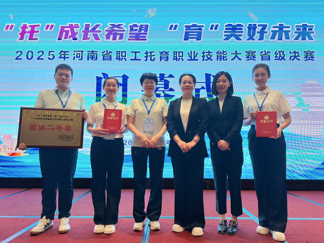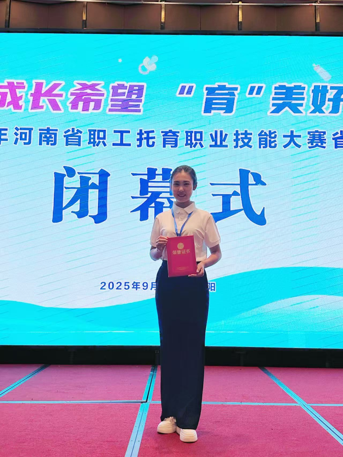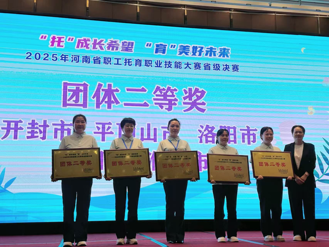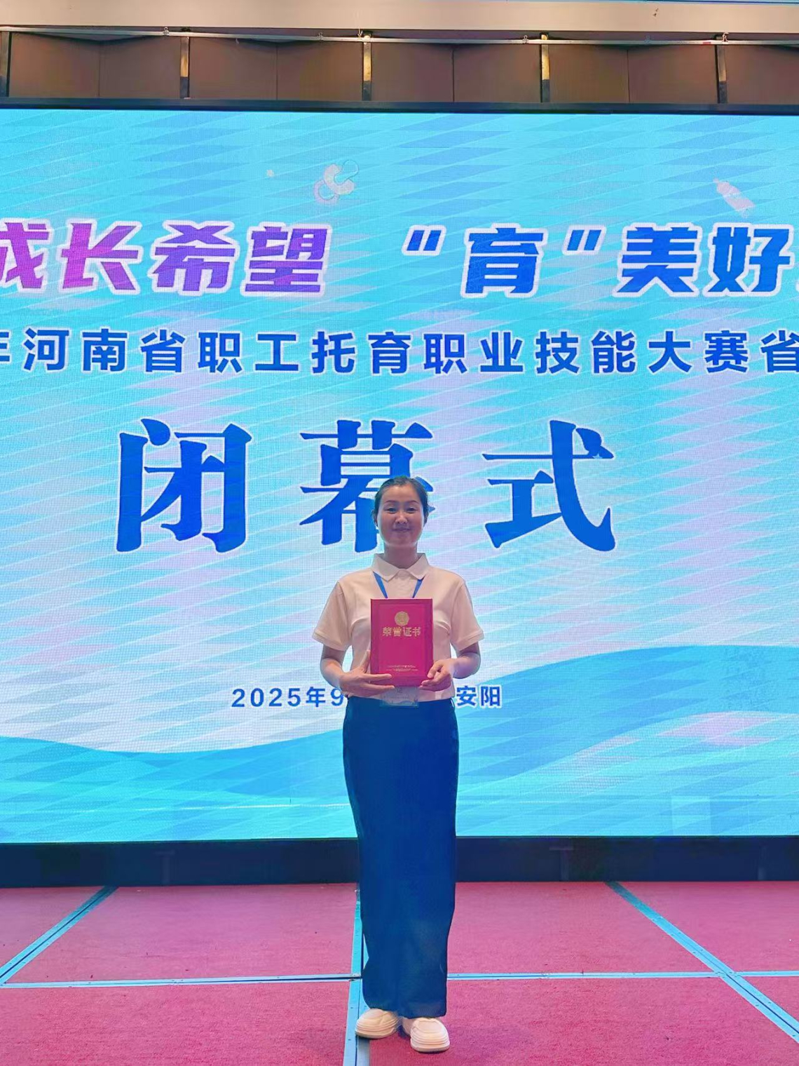平顶山市荣获全省职工托育职业技能大赛团体二等奖 平顶山市荣获全省职工托育职业技能大赛团体二等奖 李文娟获得婴幼儿发展引导员赛道第三名 李文娟获得婴幼儿发展引导员赛道第三名 王璐获得保育师赛道个人优秀奖 王璐获得保育师赛道个人优秀奖 获奖者合影留念 获奖者合影留念 Previous Next 正文 9月22日至24日,由河南省总工会、河南省卫生健康委、河南省妇女联合会主办的“托”成长希望 “育”美好未来 2025年河南省职工托育职业技能大赛省级决赛在安阳举行,平顶山市荣获全省职工托育职业技能大赛团体二等奖。参赛选手李文娟获得婴幼儿发展引导员赛道第三名,将代表河南省参加全国托育职业技能大赛。