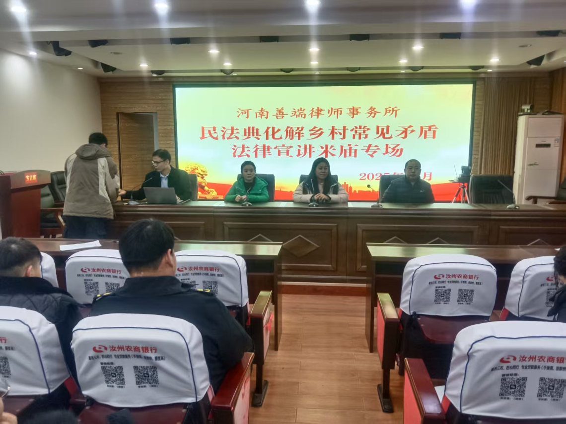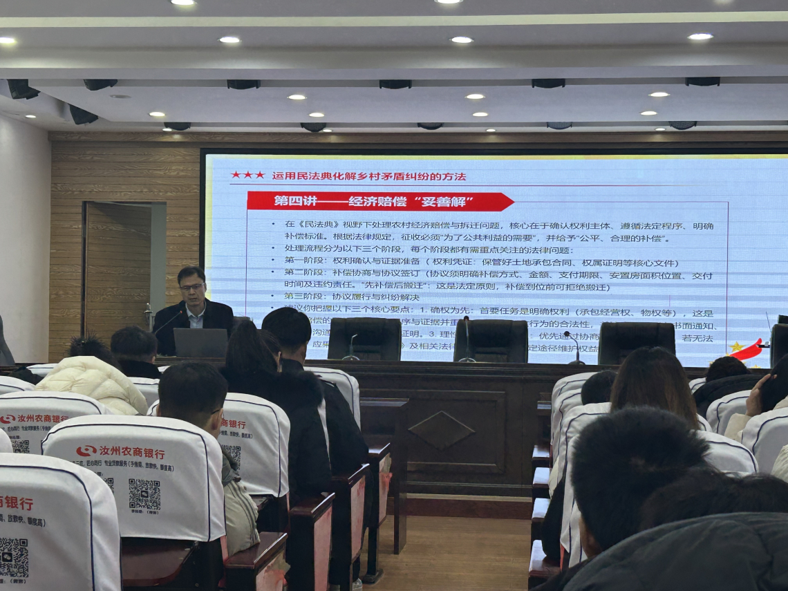 12月22日,汝州市总工会在米庙镇政府开展“民法典化解乡村矛盾纠纷”“女职工劳动保护特别规定”等法律宣讲活动。市总工会副主席闫志莹、法律基层工作部和女工部人员、米庙镇工会负责人、各村党支部书记、村长以及镇司法所和社会法庭等相关工作人员参加。