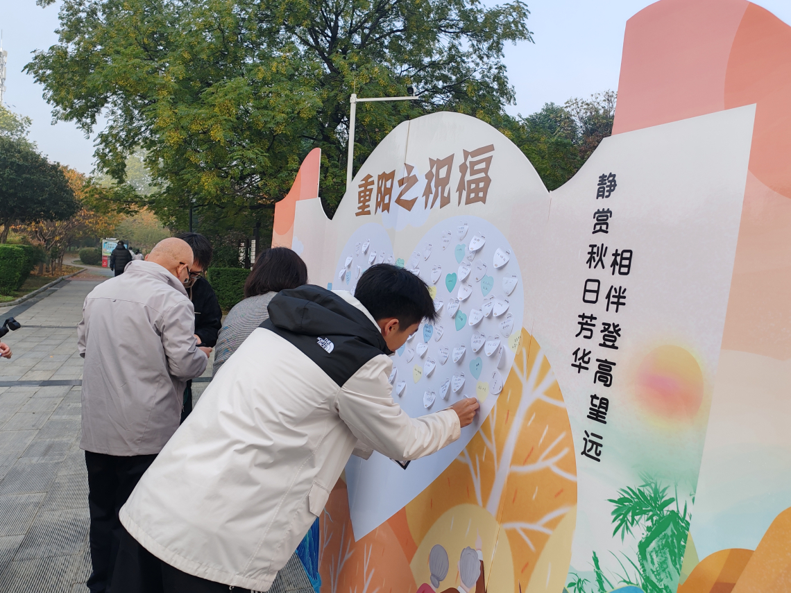 王俊娜在致辞中表示,此次活动既是对“敬老爱老、踏秋祈福”重阳传统的传承,也是总工会关爱职工身心健康的具体举措,希望职工们在活动中放松身心、增进情谊。活动设置四大主题打卡点,南门“祝福”区职工写下便利贴寄语长辈;东门“知秋”区大家亲手制作树叶书签留存秋韵;东门“牵挂”区传递对亲友的思念;西门“传承”区的古诗接龙互动,让职工在诗词中感受文化魅力。