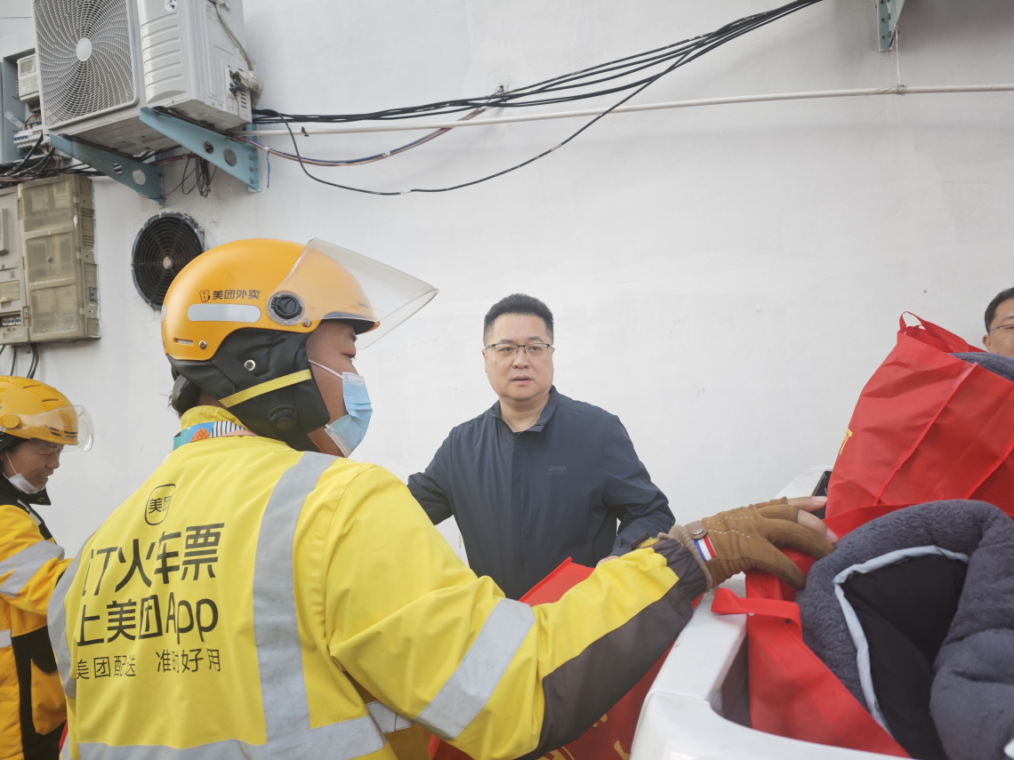 此次慰问活动前期筹备扎实,精准对接劳动者实际需求,共准备挡风被、棉手套等御寒物资200套,当日为美团外卖员、京东快递员发放120套。慰问现场,刘岳亲手将慰问物资交到职工手中,对他们在严寒中坚守岗位、服务市民生活的辛勤付出表示感谢,并反复叮嘱大家注意防寒保暖与交通安全,做到“高高兴兴上班,平平安安回家”。