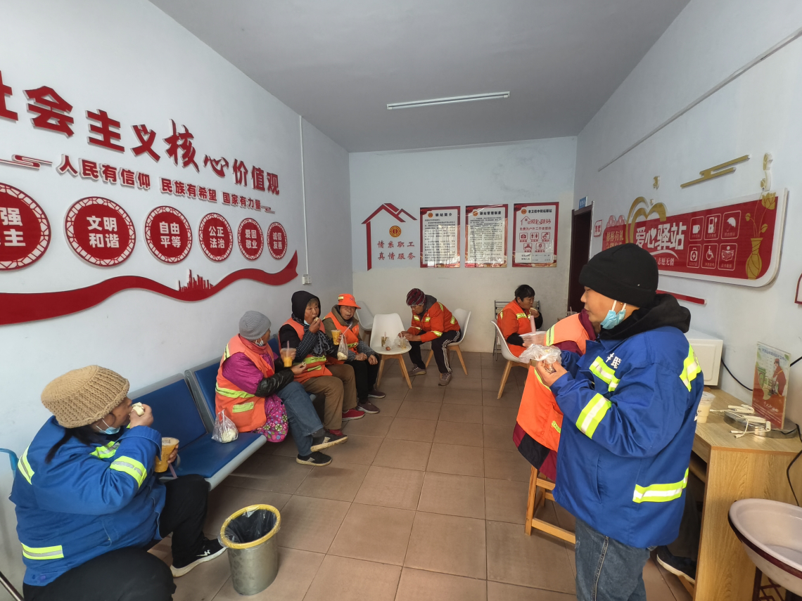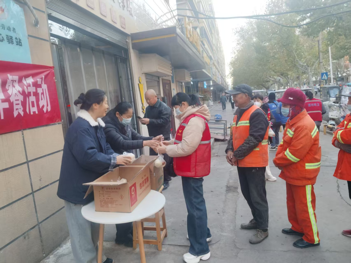 现场发餐 现场发餐 驿站内用餐 驿站内用餐 发放餐券 发放餐券 发放早餐 发放早餐 Previous Next 正文 11月28日清晨,湛河区总工会一级主任科员吕海霞来到老卫校垃圾中转站工会户外劳动者驿站,开展“支持环卫工人免费早餐”活动。天气日渐转凉,湛河区总工会心系早班环卫工人,为10家承担辖区环卫工作的物业公司送去价值30000元的早餐券6000张,让在寒风中工作的“城市美容师”们吃上热乎乎的早餐。接下来,湛河区仍将持续关注环卫工人群体,不断将“支持环卫工人免费早餐活动”推向深入,积极营造尊重环卫工人、珍惜劳动成果的浓厚氛围。