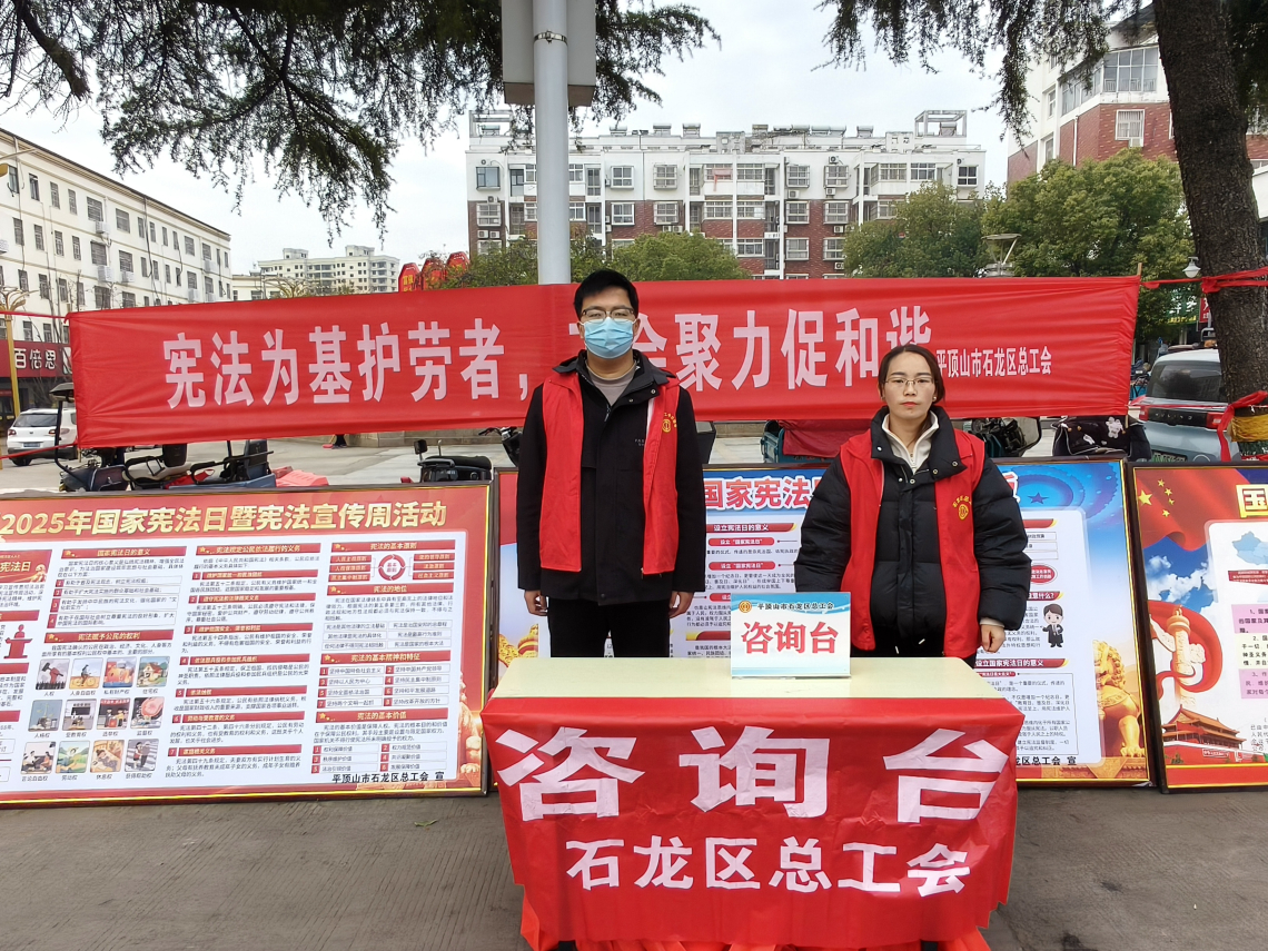 2025年12月4日是我国第十二个国家宪法日,为在全社会营造尊崇宪法、学习宪法、遵守宪法、维护宪法、运用宪法的良好氛围,石龙区总工会在圣德广场开展“宪法为基护劳者,工会聚力促和谐”主题宪法宣传周宣传活动。