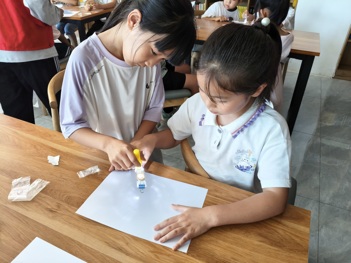 在实验环节,学生们分组协作,利用精心准备的材料包中的木片、玻璃珠、载玻片等材料,按照步骤亲手组装简易列文虎克显微镜。活动现场,孩子们全神贯注地调试设备:有的小心翼翼地固定玻璃珠,有的反复调节物距寻找最佳成像位置,还有的互相配合调整手电筒光源角度。当第一个小组成功将标本影像清晰地投射到白纸上时,现场爆发出阵阵欢呼。