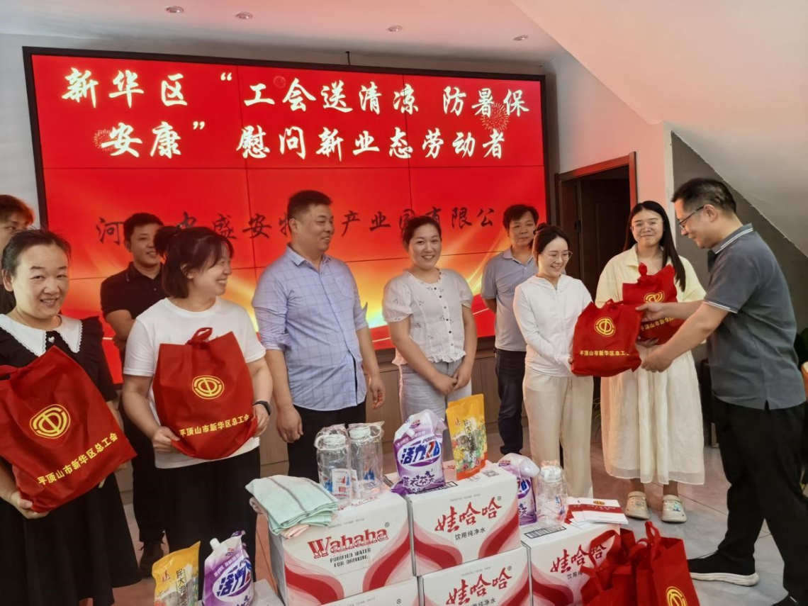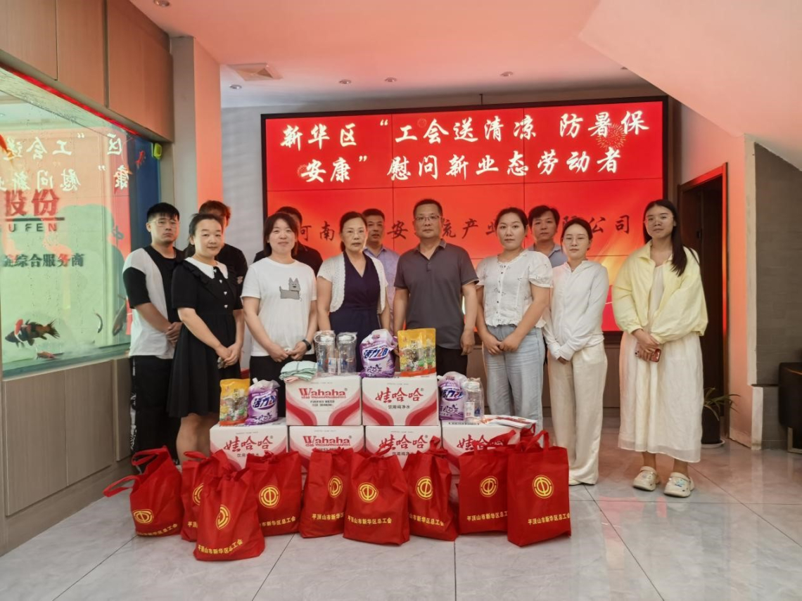 活动中,新华区新业态工会联合会慰问组前往美团外卖、河南中盛安物流产业园、平顶山市欢喜家政服务有限公司等新业态行业企业发放30余份慰问物资,对奋战在高温一线的新业态劳动者表示亲切慰问,为他们送去了矿泉水、水杯、凉茶包、洗衣液等清凉礼包,送去了丝丝清凉。