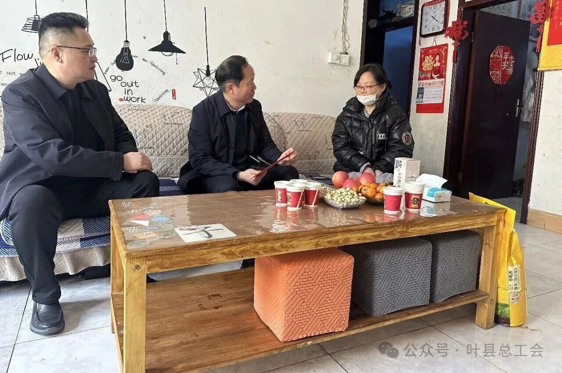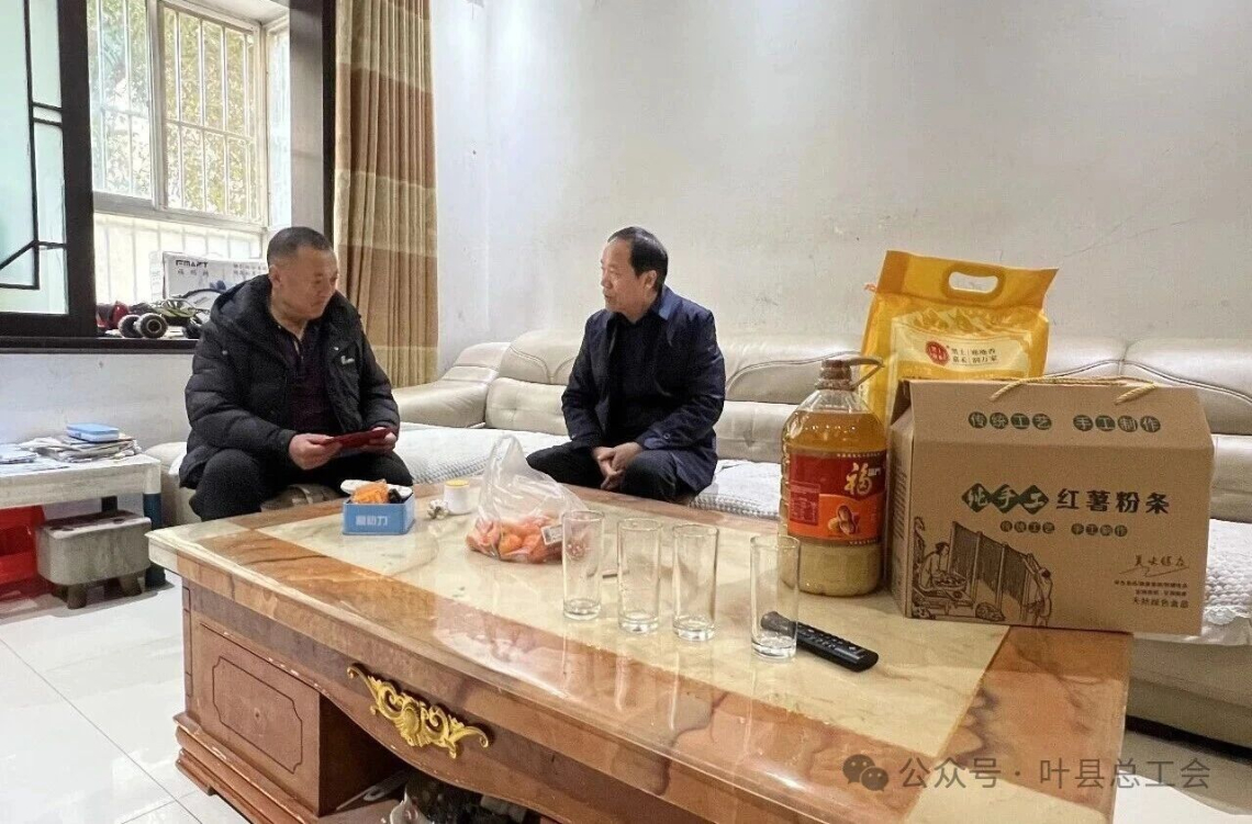 新春将至,岁寒情暖。2月13日,叶县人大常委会副主任、县总工会主席徐国领,县总工会党组书记、副主席刘岳前往叶县中等专业学校困难职工马纳鸽、粮食局困难职工李学民家中,开展走访慰问,为他们送去慰问金和米、面、油、粉条等慰问品,把党和政府的温暖以及工会组织的关爱送到职工身边。