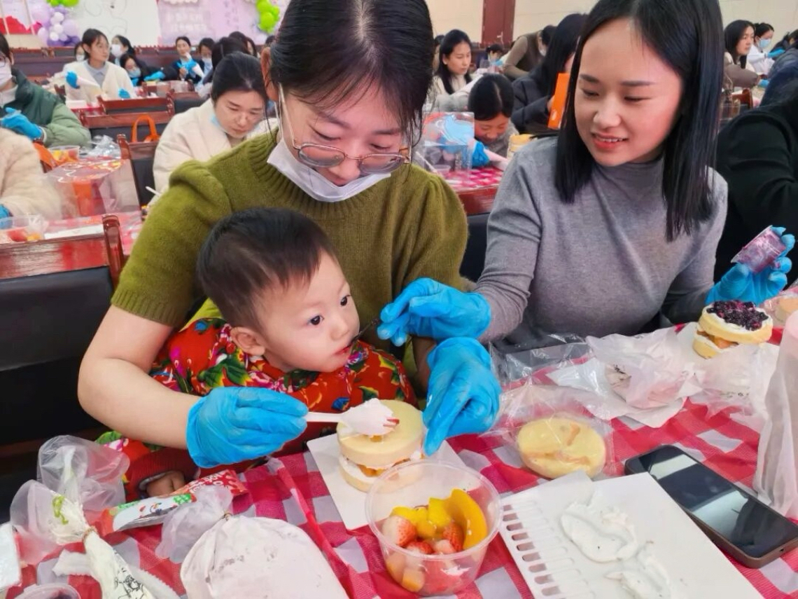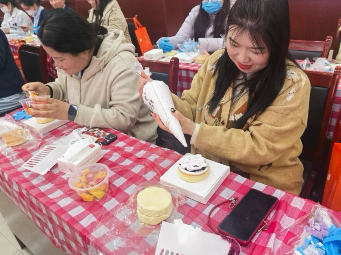 活动现场暖意融融、香气四溢。医院特别邀请专业烘焙老师现场教学,从蛋糕胚组装、奶油打发、抹面技巧到创意裱花、水果装饰,一步步细致讲解、手把手示范指导。平日里,她们是坚守临床、守护健康的医者,用专业与温柔扛起责任;此刻,她们暂别诊疗台,化身创意烘焙师,在奶油的绵密与果香的清新中,解锁生活的小美好。