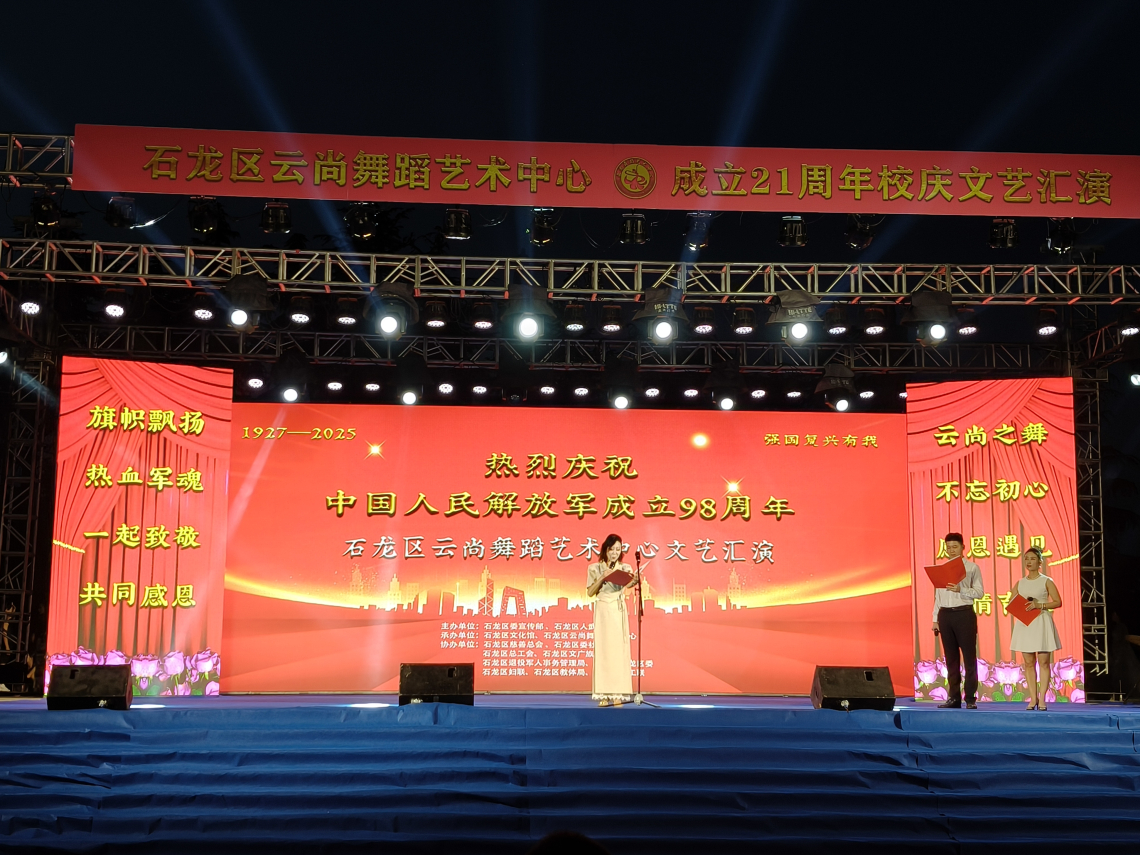 为庆祝中国人民解放军建军98周年,传承红色基因,丰富职工群众精神文化生活,7月31日晚,石龙区庆祝建军98周年文艺汇演在龙湖广场隆重举行。本次活动由区委宣传部、区人武部主办,区总工会联合区文化馆、区慈善总会、区委社工部、区文广旅局、区退役军人事务局、区妇联、团区委、区教体局、区义工联、区云尚舞蹈艺术中心共同举办。