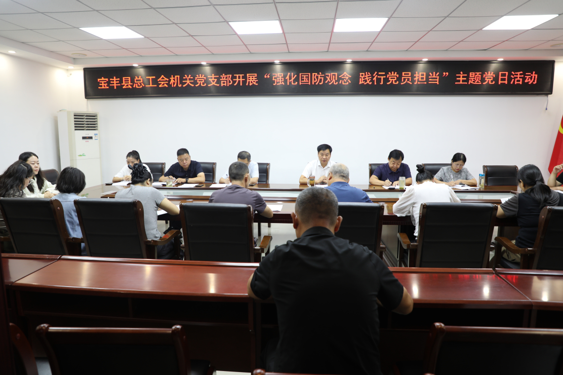 为厚植党员国防情怀,激发担当精神,9月5日上午,宝丰县总工会在机关东三楼会议室,组织开展了“强化国防观念 践行党员担当”主题党日活动,机关全体党员干部参加。