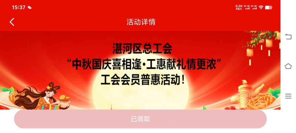 活动公告页面 活动公告页面 正文 中秋节,团圆节,月饼圆,合家欢,明月清风,风送祝福。在我国传统节日中秋节到来之际,平顶山市湛河区总工会在“工会E卡”APP平台开展“中秋国庆喜相逢·工惠献礼情更浓”工会会员普惠活动,与广大职工会员共庆中秋。凡在“工会E卡”APP注册绑卡的湛河区工会会员,通过领取优惠券,即可在德信泉连锁商超任一门店,支付1元兑换价值30元购物券一张。本次活动共发放优惠券1000张。