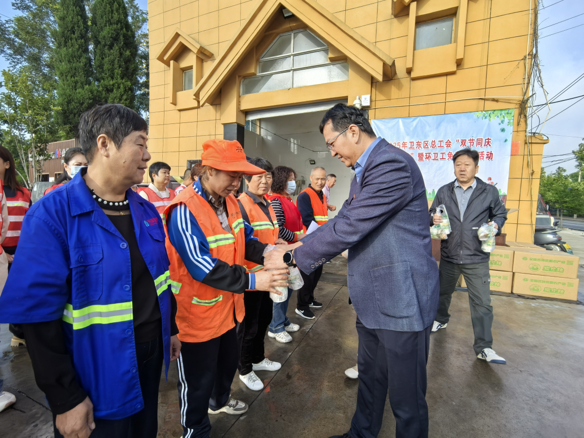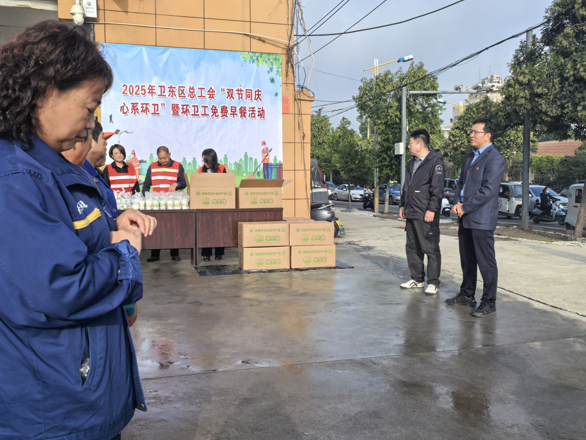活动现场 活动现场 活动现场 活动现场 Previous Next 正文 9月30日上午,2025年区总工会"双节同庆 心系环卫"暨环卫工免费早餐活动在区环卫中心举行。区总工会和环卫中心相关负责人出席本次活动。 在国庆、中秋双节来临之际,区总工会特意为一线辛勤工作的250名环卫工人安排了月饼、包子、鸡蛋和豆浆等早餐,亲自送到他们的手上,让他们感受到区委区政府的关怀与工会组织的温暖,进一步激励全区环卫工为卫东区高质量发展作出贡献。