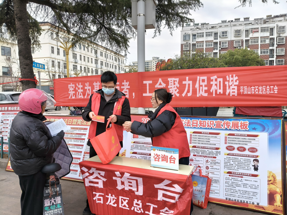 2025年12月4日是我国第十二个国家宪法日,为在全社会营造尊崇宪法、学习宪法、遵守宪法、维护宪法、运用宪法的良好氛围,石龙区总工会在圣德广场开展“宪法为基护劳者,工会聚力促和谐”主题宪法宣传周宣传活动。
