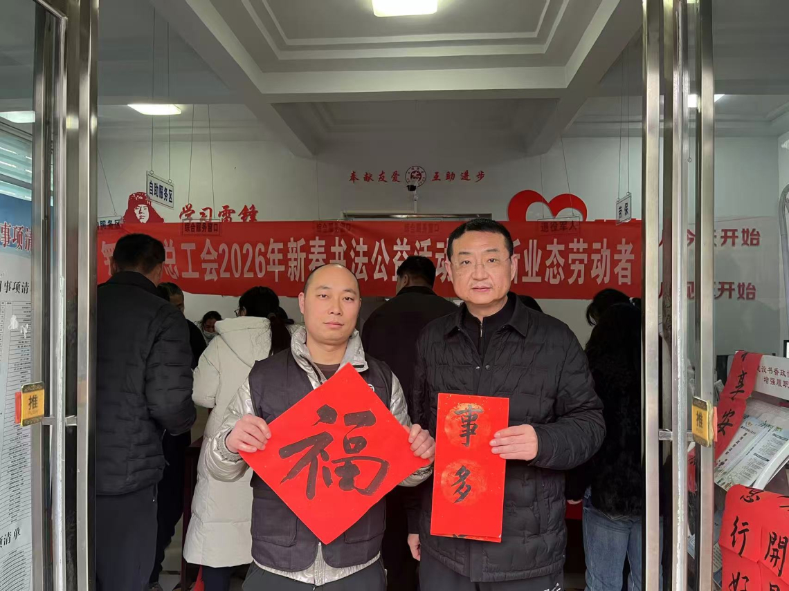 活动现场墨香四溢、暖意融融,书法家与书法爱好者们挥毫泼墨、笔走龙蛇,将美好期许凝于笔端,一幅幅寓意吉祥的春联、一个个饱满灵动的“福”字跃然红纸之上。兼具马年特色与美好祝愿的书法作品,被一一送到职工手中,大家手持红联福字,脸上洋溢着幸福笑容,现场满是喜庆祥和的节日氛围。