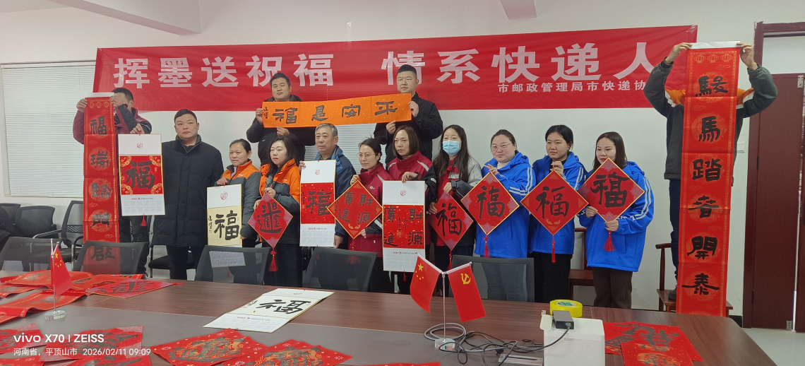 岁末天寒,暖意融融。2 月11 日上午,平顶山市快递行业工会开展 “挥墨送祝福 情系快递人”书法公益慰问活动,将文化祝福与暖心关怀送到快递小哥手中,向他们辛勤付出致以崇高敬意和新春美好祝福。