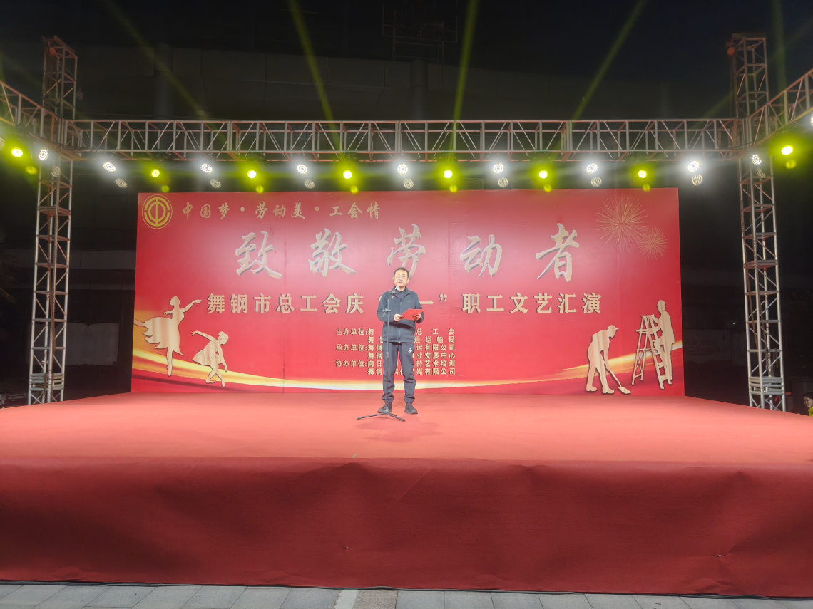 演出正式开始前,舞钢市总工会党组书记、常务副主席李飞致辞,向辛勤耕耘在全市各行各业、各条战线上的广大劳动者致以节日的问候和诚挚的祝福,向各级劳模、先进工作者、一线基层职工致以崇高敬意。致辞表示,希望全体劳动者以榜样为力量,立足岗位、奋勇争先,以实干担当书写新时代劳动答卷,为全市高质量发展贡献工会力量和职工智慧。