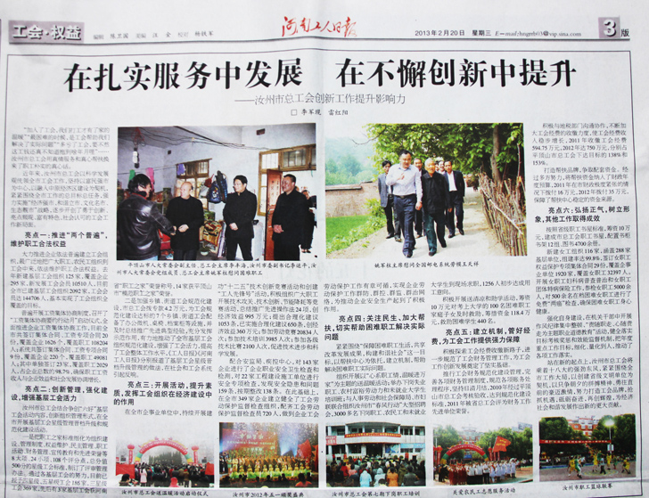 近年来,汝州市总工会以科学发展观统领全市工会工作,坚持以富民强市为中心,以融入中原经济区建设为契机,紧紧围绕全市工作的总目标总任务,强力实施“经济强市、和谐立市、文化名市、生态靓市”战略,逐步开创了勇于创新、亮点频现、富有特色、社会认可的工会工作新局面。